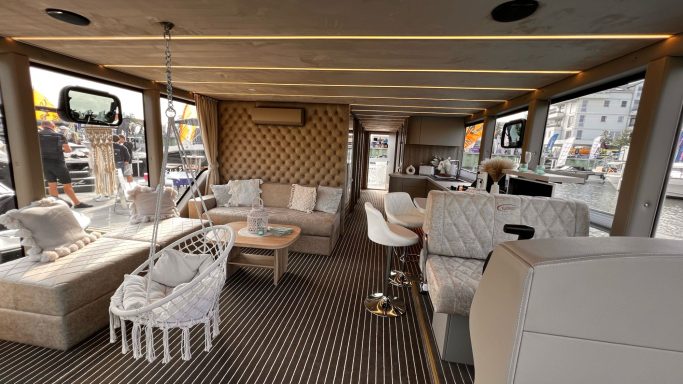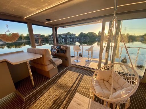 Das großzügige Sonnendeck mit über 35 m² Fläche ist ein Ort voller Möglichkeiten zur Entspannung und Erneuerung. Umrahmt von einem stilvollen Edelstahlgeländer, lädt es dazu ein, die Seele baumeln zu lassen und neue Energie zu tanken. Der breite Freitreppe ermöglicht einen mühelosen Zugang zu diesem Rückzugsort. Fast die Hälfte des Decks kann durch ein praktisches, faltbares Bimini-Verdeck in angenehmen Schatten gehüllt werden, sodass du jederzeit die perfekte Atmosphäre genießen kannst. Zudem ist das Sonnendeck mit einer bequemen Polyrattan-Lounge, zwei Fatboy-Sitzsäcken und zwei einladenden Sonnenliegen ausgestattet.